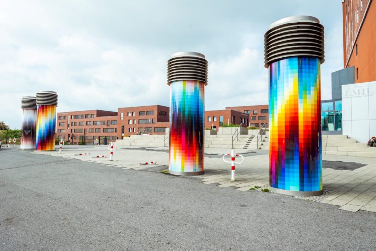 The Dortmunder U is located in Dortmund’s creative district „Unionviertel“, a typical place in of the urban Ruhr area where you can see recent changes taking place. War damage and converted industrial plants (there used to be seven large breweries here) have left their mark on the architecture; in a densely interwoven network of streets, old Art Nouveau buildings, dreary post-war architecture and ambitious new buildings are flirting for the favour of residents and visitors. For a while things did not look good, but then more and more young people and artists discovered this area for themselves. This is not just evident from the many shops where studios and creative businesses have settled down, but also from the many walls on which street artists have left their mark